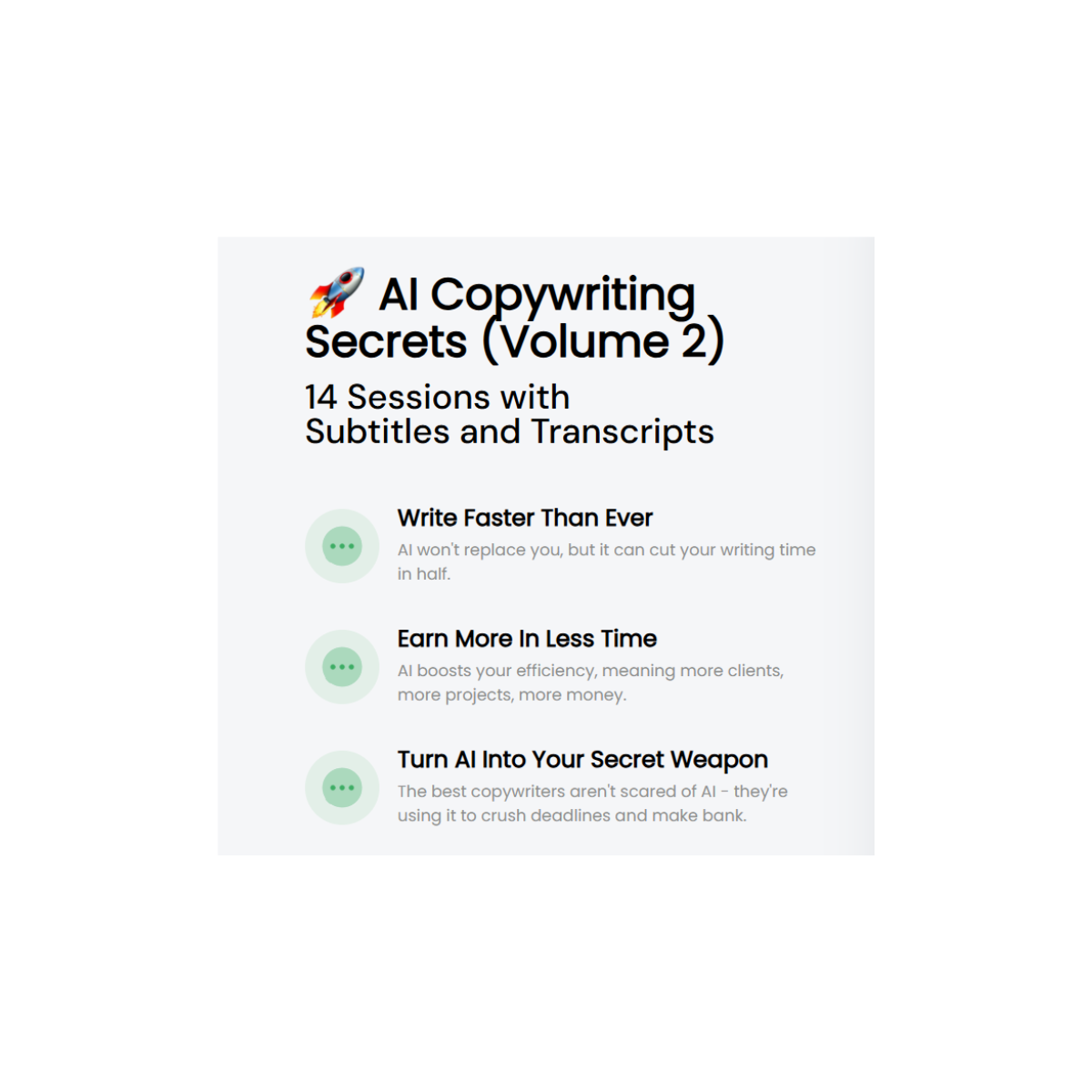 When you buy the Drop Dead Copy – AI Copywriting Secrets (Volume 2) Course, you unlock a set of tools and strategies that go beyond the basics: